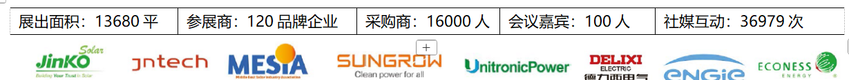 到2030年,阿联酋清洁能源支出将达到2000亿迪拉姆!展会现场将聚集优质厂商、服务商,为阿联酋太阳能与储能行业带来新技术和新未来,促进阿联酋的能源转型并带来太阳能、能源生产、电池、存储解决方案和清洁能源创新。该展会将所有主要利益相关者联合起来,公用事业、IPP、政府、采购商等。Terrapinn成立30余年,利用强大的媒体和行业资源为企业提供交流和创新平台,主要能源展会有南非、肯尼亚、尼日利亚、沙特、阿联酋、尼日利亚、埃及、英国、瑞士、意大利、荷兰、法国、西班牙、澳洲、菲律宾、马来西亚、越南、印度尼西亚,遍布全球主要光伏和储能市场。展会主要参与者有:阳光电源、华为、锦浪、宁德时代、晶科、晶澳、天合、隆基、比亚迪、安泰、中信博等。英尚利华会展作为展会的官方代理,将继续为企业提供优质展位和服务,并协助条件的企业申请“中小企业国际市场开拓资金补贴”。